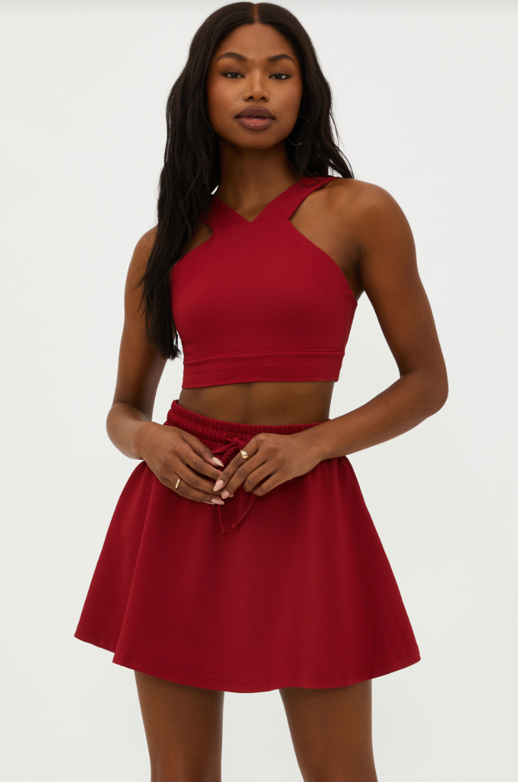 The Adia Top is our high-neck sports bra with a high halter neckline, thick fixed straps, and a wide band under the bust for extra support. It is featured in our textured waffle fabrication, which has a 4-way stretch and moisture-wicking properties. Pair it with the matching Piper Legging or Lyana Skirt in Rio Red Waffle for the perfect set from the gym to the court.