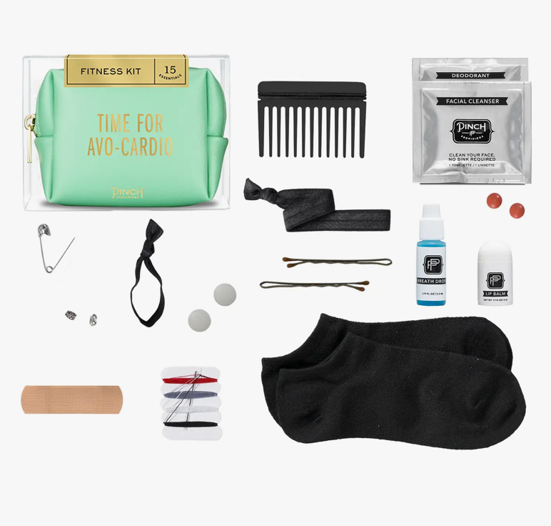Survival of the fittest. Stash this 15-piece Fitness Kit by Pinch Provisions in your gym bag and focus on what matters: having a great workout! From emergency socks to a headband, lip balm to a bandage, this kit is full of fitness essentials to help take the work out of working out. Now in two styles: symbol (Beating Heart) or sentiment (Time for Avo-cardio).