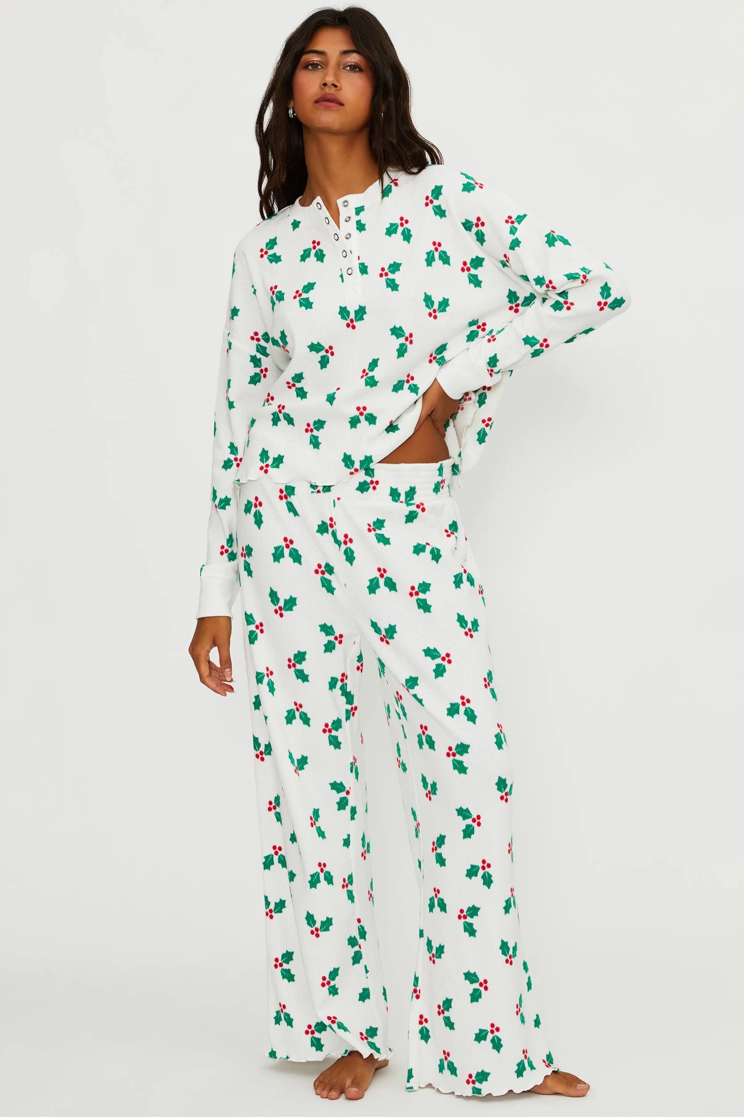 - Festive holly print throughout