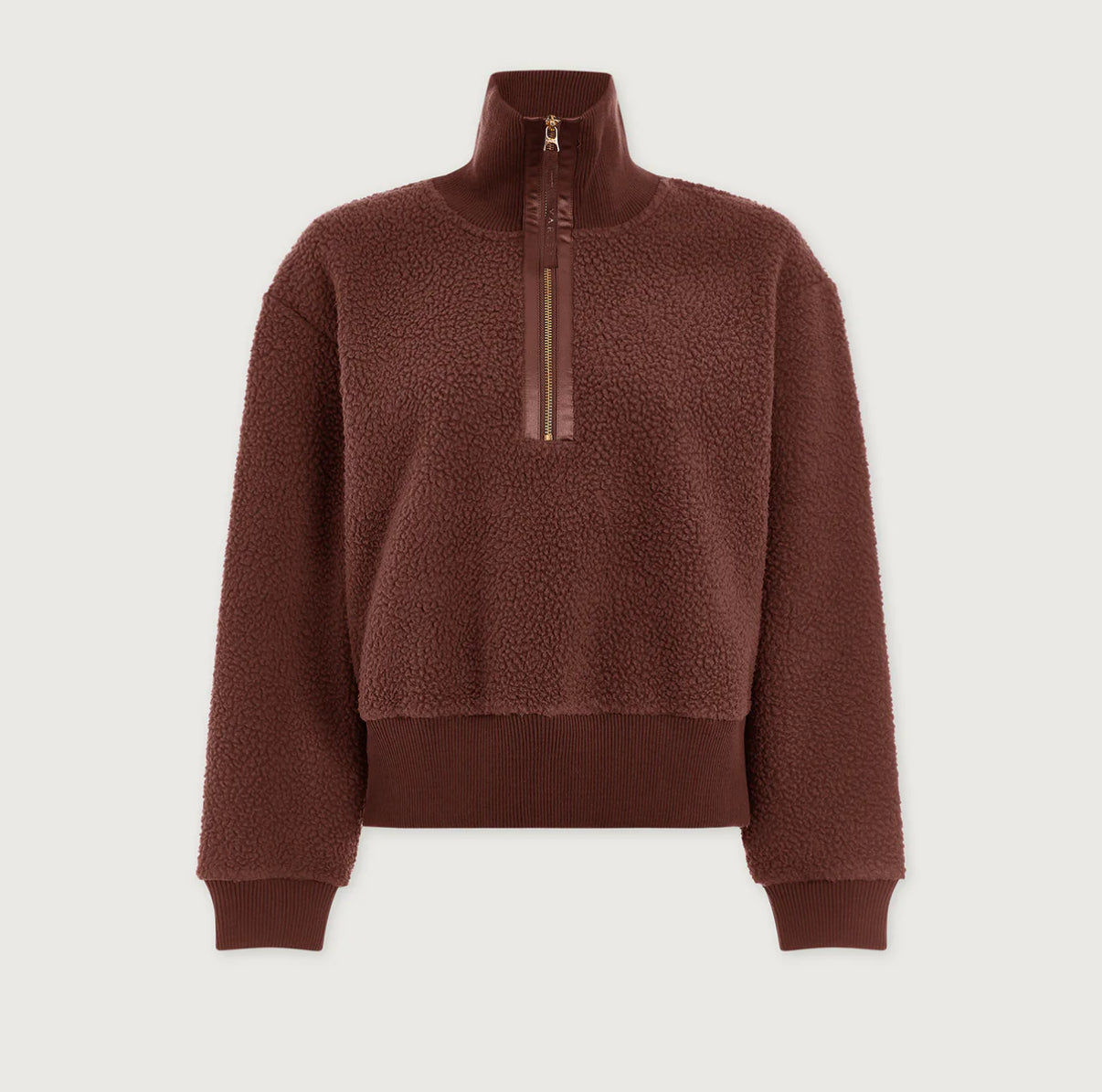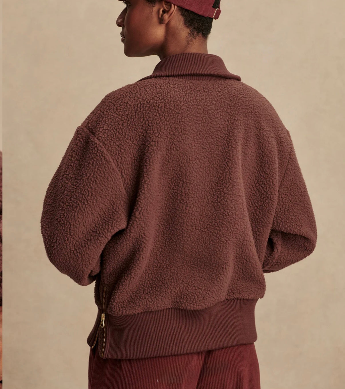 Spotlighting our 100% Recycled Plush Borg Fleece, this style is cut with a half-zip collar, ribbed cuffs and loose fit sleeves. Trademark side zip detailing and a luxe sateen trim elevate the design. Fabric: 100% Recycled Polyester